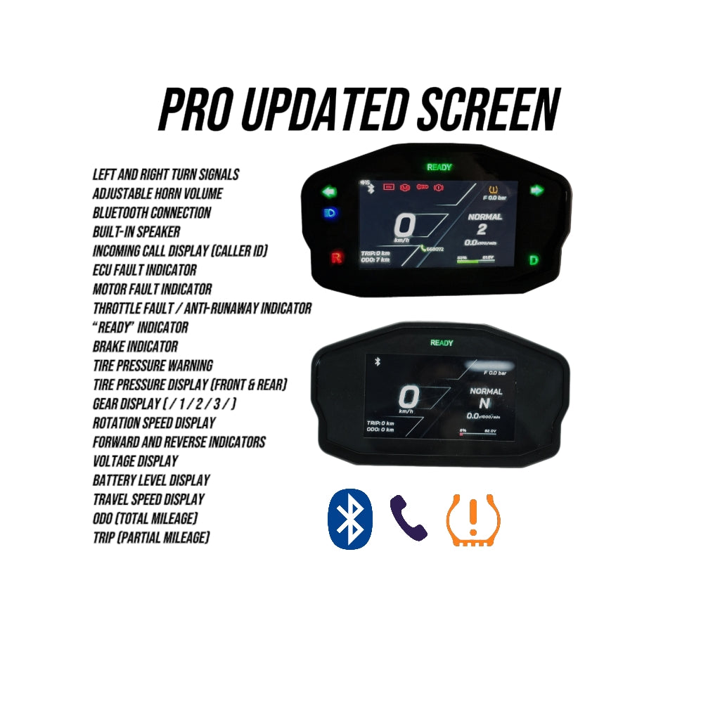 Stay informed of low tire pressure, monitor speed and battery in real time, view calls on-screen, enjoy Bluetooth connectivity, track mileage, check diagnostics and alerts, switch directions easily, and keep full control of your vehicle at a glance.